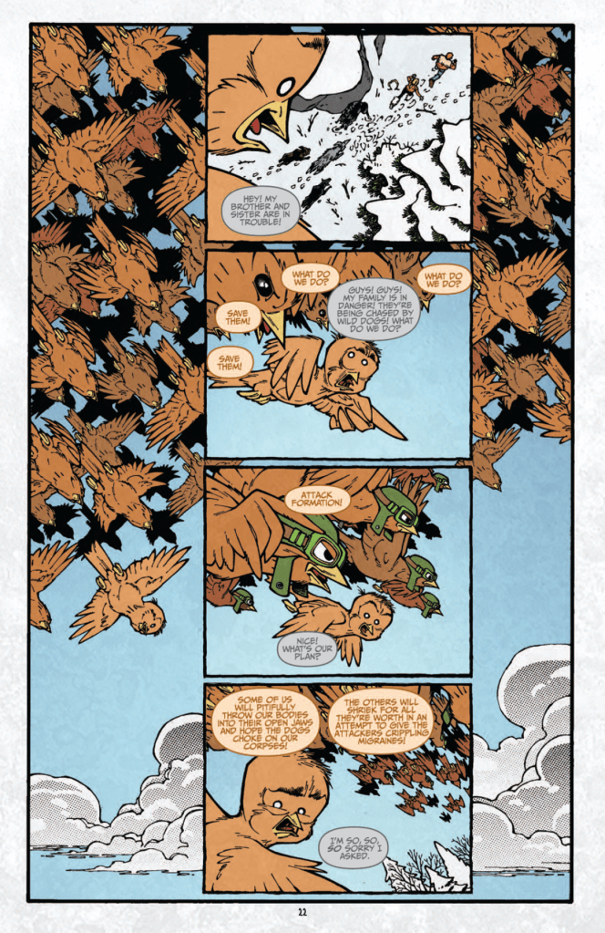And finally, the art continues to be visceral and gory, but with a bit of a nostalgic twist in one of the stories. The first story, “Sparrow”, involves Bode trying to make friendships but preferring isolation, and he eventually puts himself into the body of a sparrow for a bit of time. And this is all drawn and written in a way that is in tribute to “Calvin and Hobbes”, a comic that has been near and dear to my heart since I was a small child. While it’s true that some of the juxtapositions of the nostalgic and bright Watterson style mixed with the gore and violence of “Locke & Key” is unnerving, I honestly thought that it was super charming and fun to give Bode this kind of adventure with a loving tribute to a cartoonist and storyteller that clearly inspired the Hill and Rodríguez.
