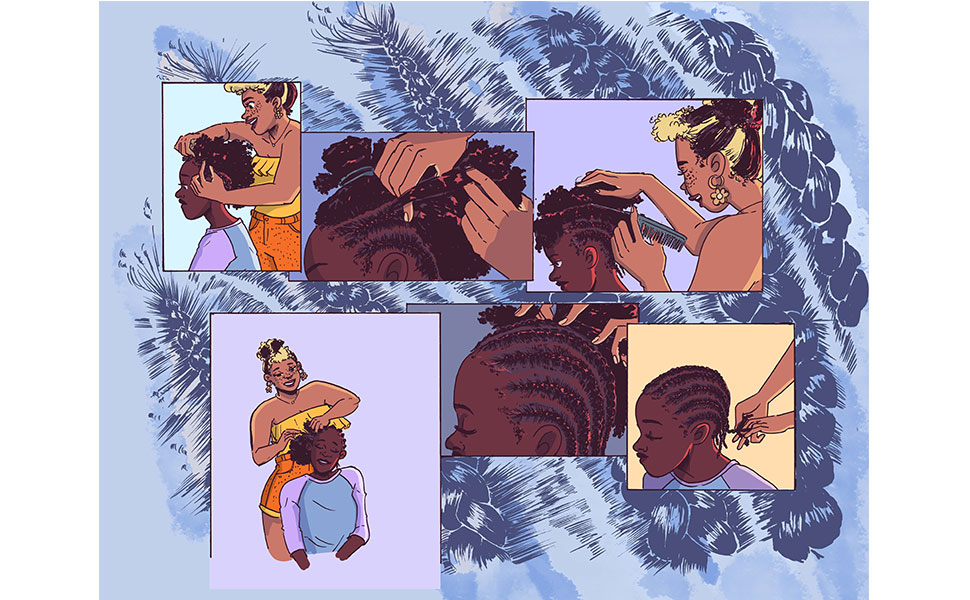 In expanding the story of Kim and her friends, the authors pay tribute to Black sisterhood through portraits of shared, yet deeply personal experiences of Black hair care. From self-care to spilling the tea at an hours-long salon appointment to healing family rifts, the stories are brought to life through beautifully drawn characters and different color palettes reflecting the mood in each story.