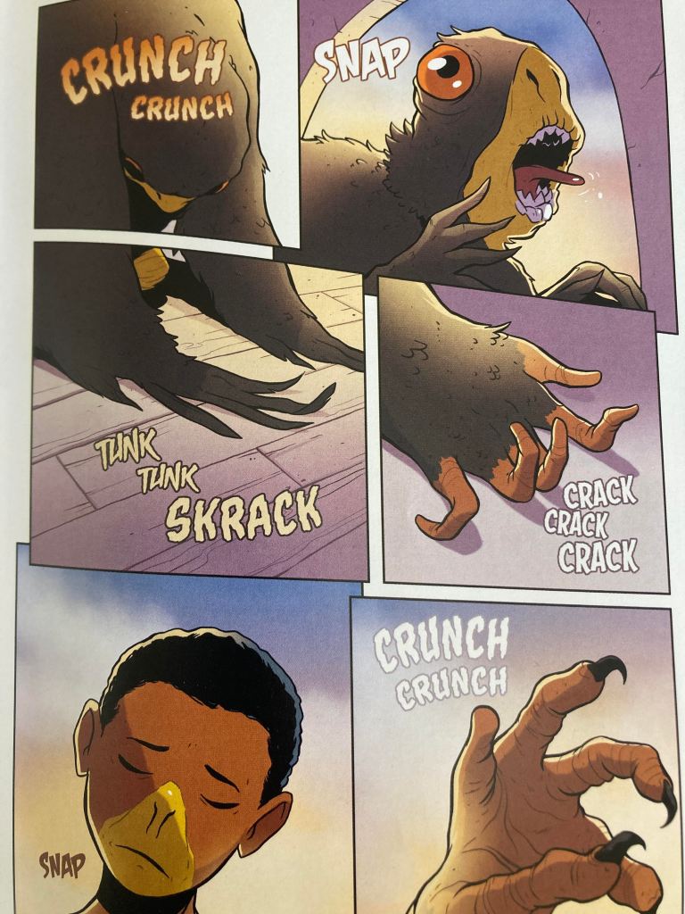 The Comic Relief: Marco is pretty much the same here as he is in the book. We get more groundwork laid about his home life and why he’s reluctant to fight. His dialogue is by far the funniest and best, per the book’s standard as well. There was one throwaway bit that I thought was odd, however. At one point, a character, I think it was Cassie, compliments Marco on his haircut. From the books, we know this does happen and is commented on but it doesn’t happen until Marco’s second go around as a narrator, all the way through to book number 10. But then the really strange thing is that Marco was depicted with short hair in the first graphic novel, too. Which, honestly, given my comments already about the cartoon style proving challenging to differentiate between male or female characters, I can see the choice to not have him with long hair from the very start. But looking back at the art from the first book, it’s clear that the styling for his hair is slightly different, but if anything, it’s drawn as longer and more shaggy here in the second book, not cut shorter at all. It’s very strange. I don’t think this small of a change really warranted any dialogue at all, but then to write it in as a notable haircut rather than a style change, which is the most that can be said, is strangely incongruent.